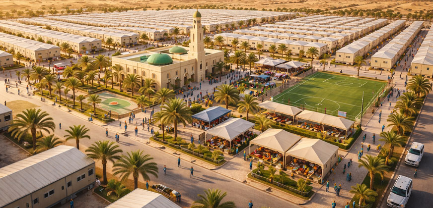 Arabian Wings Oasis provides fully managed workers camp solutions supporting construction projects, industrial operations, and long-term workforce deployments. Camps are designed to meet regulatory compliance, safety standards, and hygiene requirements while ensuring workforce comfort and operational efficiency. Facilities include accommodation units, sanitation systems, dining areas, power distribution, water supply, waste management, and recreational amenities based on project scale and occupancy needs. The company manages site preparation, camp installation, utility connections, preventive maintenance, housekeeping coordination, and compliance inspections to ensure uninterrupted operations. Flexible deployment models support short-term mobilization and long-term project requirements while enabling predictable cost control and scalable capacity expansion across multiple project locations.